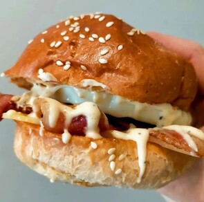 Crispy bacon, fried egg and onion relish on a toasted bun // $17